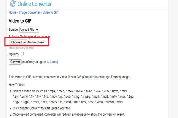 بعد فتح الموقع ستفتح معك واجهة التحكم, ما عليك سوى أن تقوم بالنقر على زر Choose File, الجميل أنه يمكنك تحويل فيديو في حدود 200 MB و هذا أمر جد جيد.